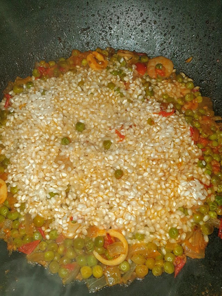 Quando manco 3-4 minuti alla cottura, piu’ o meno quando mancano 4 mestoli, siete pronti ad aggiungere le cozze,visto che i molluschi non necessitano una lunga cottura altrimenti diventano collosi.